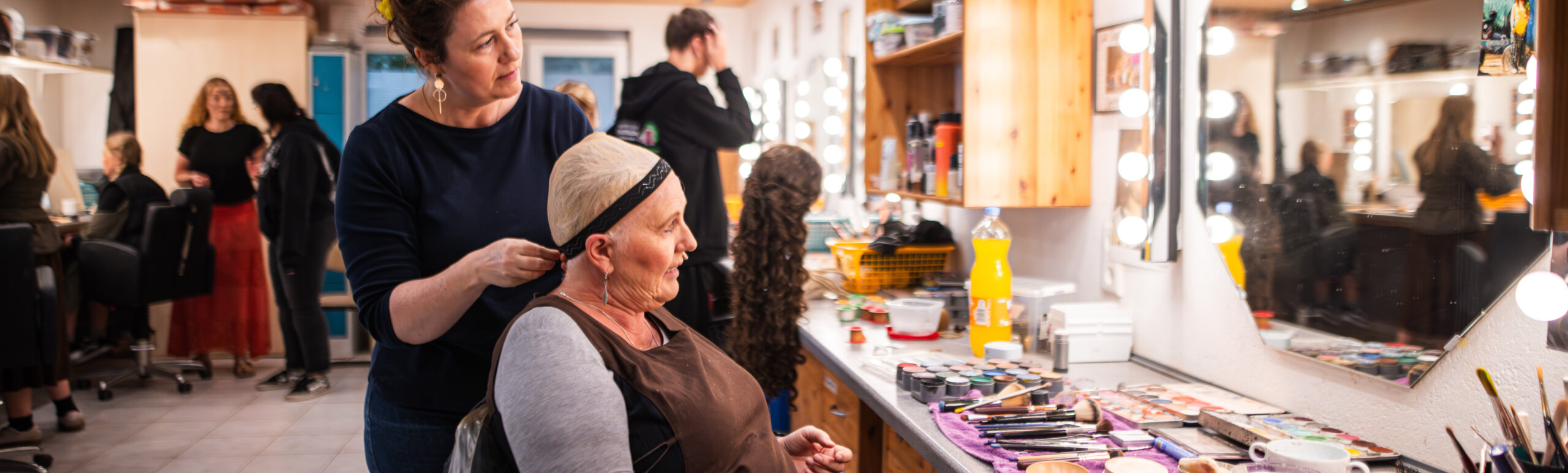 Die Maske sorgt vor und während jeder Vorstellung dafür, dass alle Darsteller*innen passend für ihre Rolle auf die Bühne gehen. Hier wird geschminkt, frisiert und verwandelt, von der einfachen Alltagsfrisur bis hin zum aufwändigen Bühnen-Make-up. Kurz vor den Aufführungen herrscht hier Hochbetrieb, damit alles rechtzeitig fertig ist.